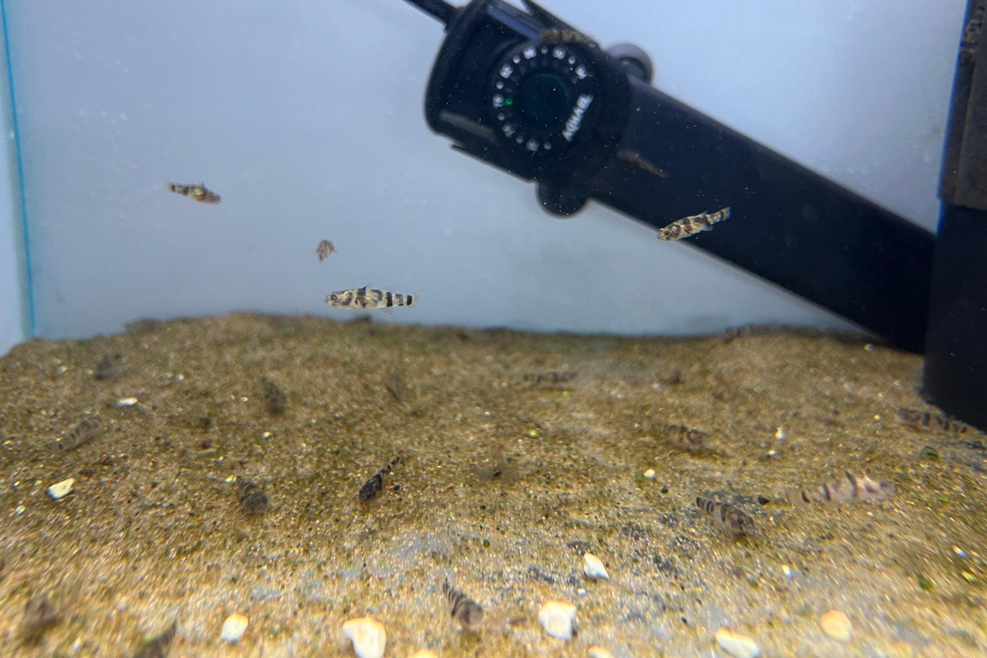 Bumblebee Gobies thrive in groups of 3–6 and prefer a well-structured tank with smooth substrate, rocks, and hiding spots. They are peaceful but territorial toward other gobies of the same species. These hardy fish are carnivorous and do best on a diet of small live or frozen foods such as brine shrimp, daphnia, and bloodworms.